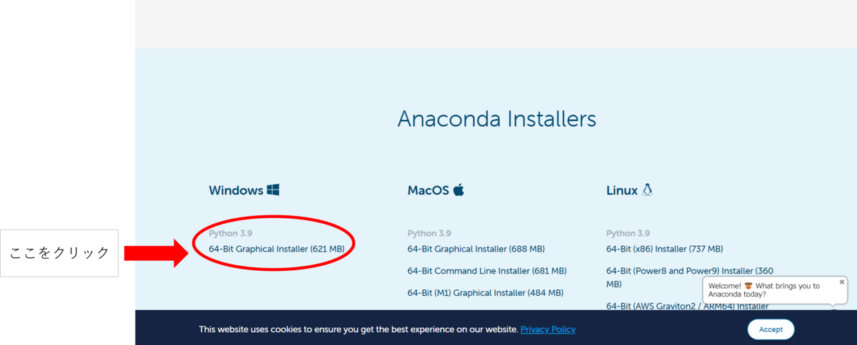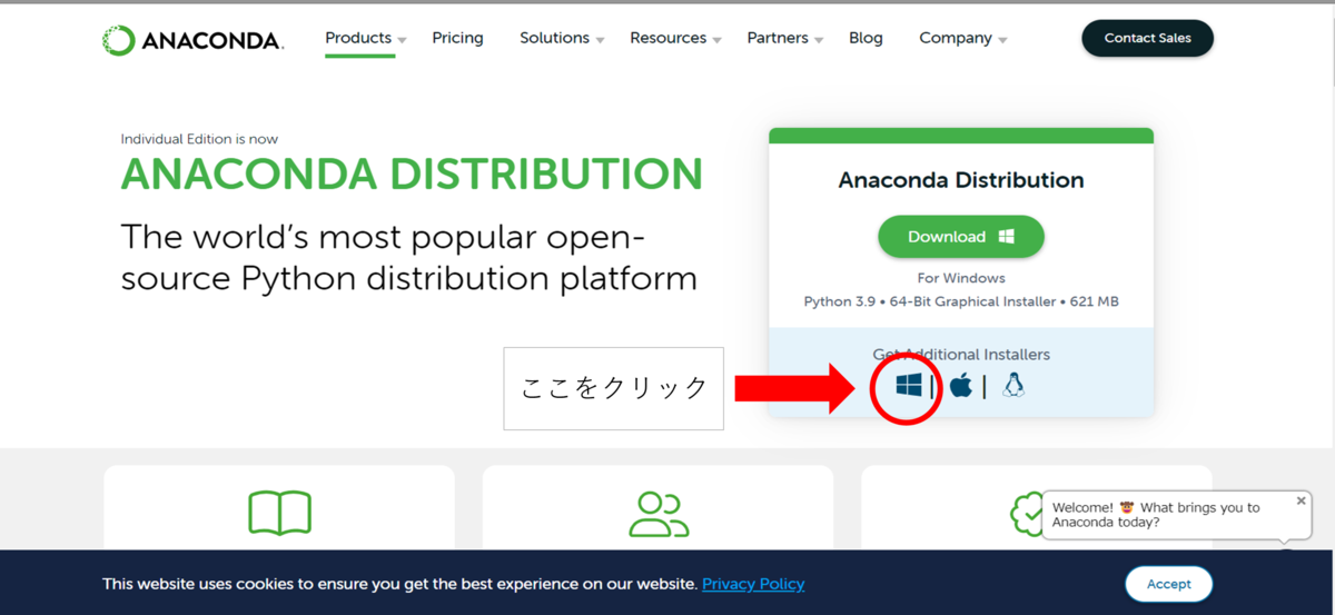 下記のリンク先からanacondaの公式ホームページに移動してください。