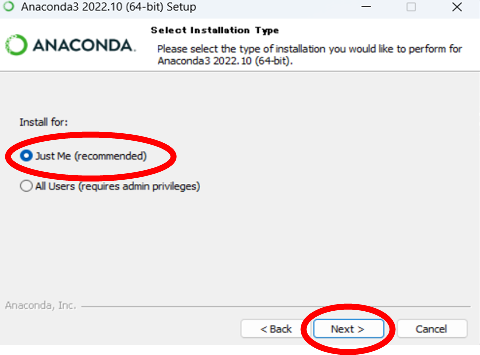 「Select Installation Type」画面が出てきたら、「Just Me(recommended)」にチェックを入れた状態で、「Next >」ボタンを押してください。
