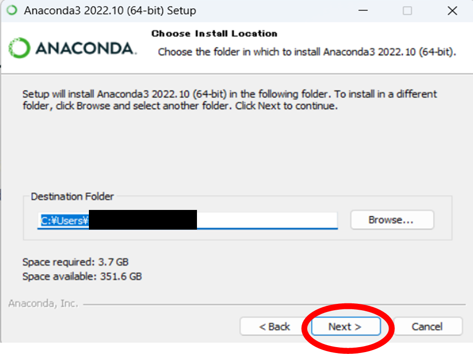 「Choose Install Location」画面が表示されたら、インストール先にこだわりがなければ、そのまま「Next >」ボタンを押してください。もしインストール先を変更する場合は、ここで変更してください。