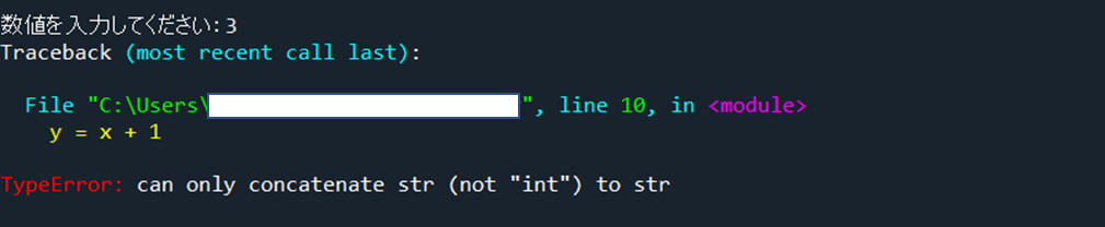 これは、y = x + 1の行でエラーが発生しており、文字と数字を足し算できませんというエラーになります。