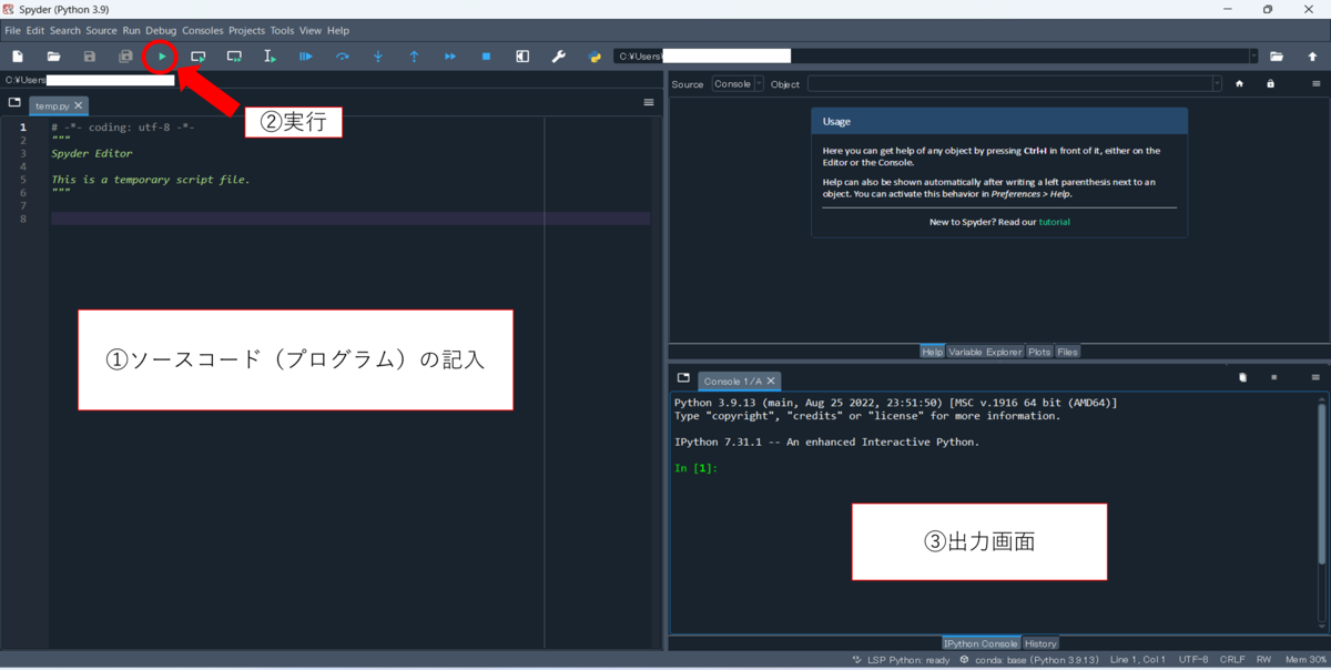 記載にもあるように、Spyderは統合開発環境となっております。初めてPythonを触る人にとっては、無料で①プログラム(ソースコード)が書ける、②エラー確認ができる、③プログラムを実行できるの3つの機能が使いやすいと思っていただければ大丈夫です。