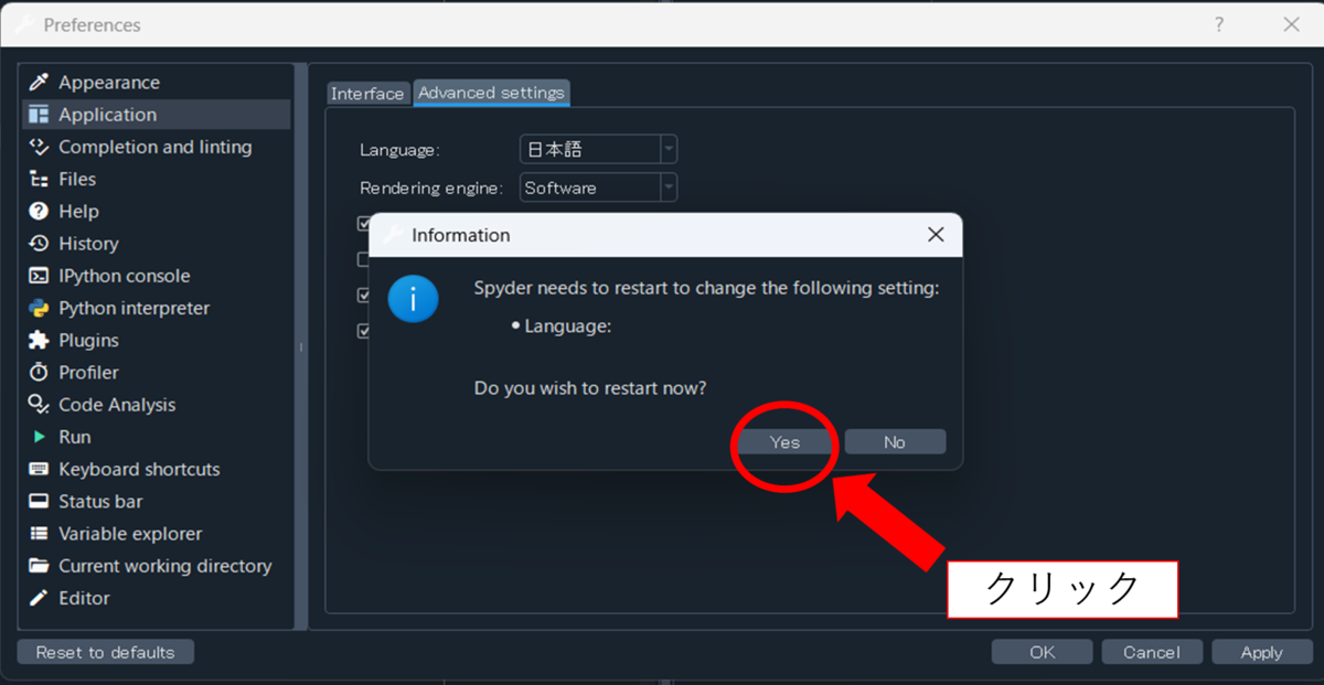 最後に、言語設定の変更を有効にするのかどうかを聞かれるポップアップが開きますので、「Yes」を押してください。するとSpyderが再起動されて日本語設定に切り替わっていることを確認してください。