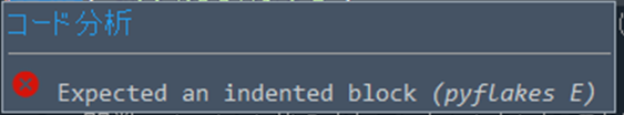 もしインデントをつけずに記入すると下記のような「Expected an indented block (pyflakes E)インデントの位置が間違ってますよ」とエラーが出されますので注意して下さい。(Spyderのエディターで記入時)